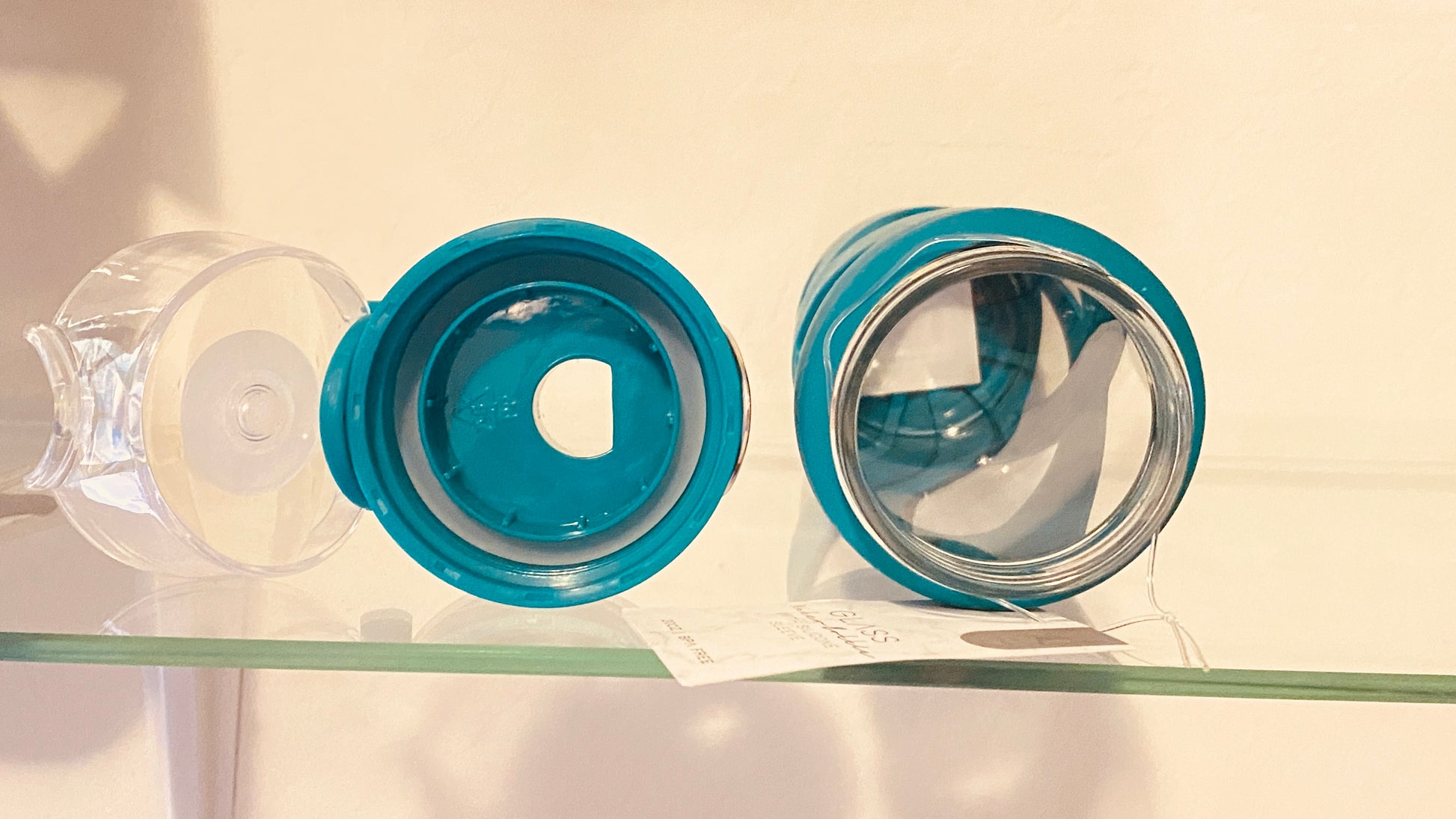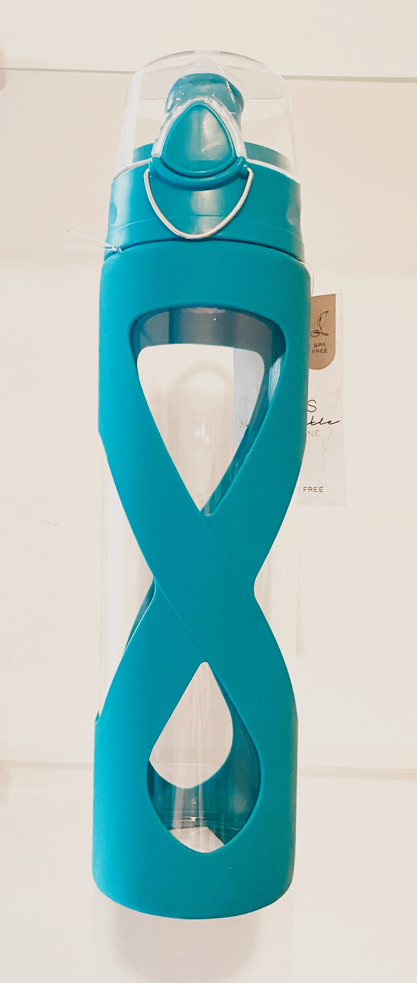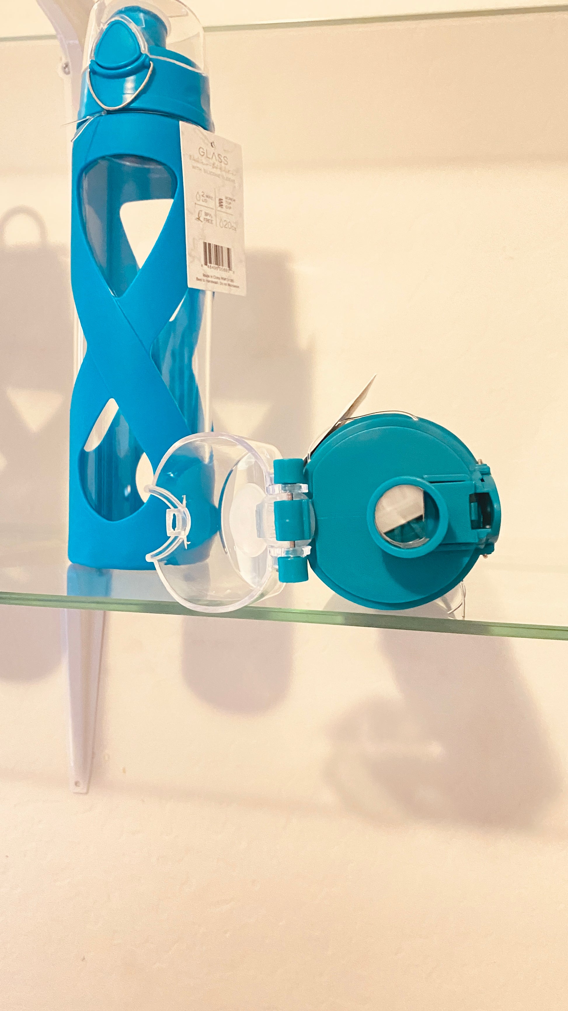 Paired with a durable glass water bottle protected by a turquoise silicone sleeve that offers superior grip and insulation.