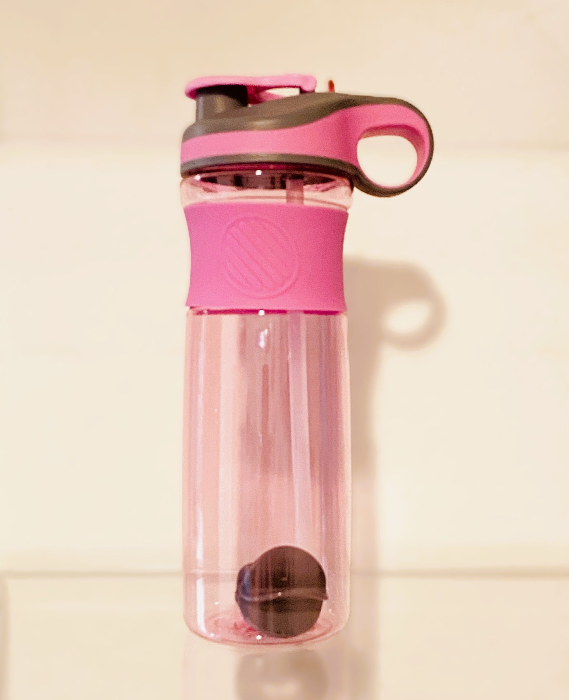 Paired with this pink durable mixer water bottle that offers on the go preparation, for your protein shakes and smoothies.