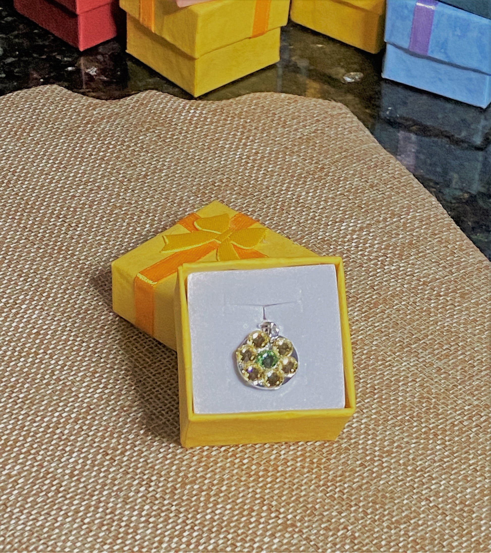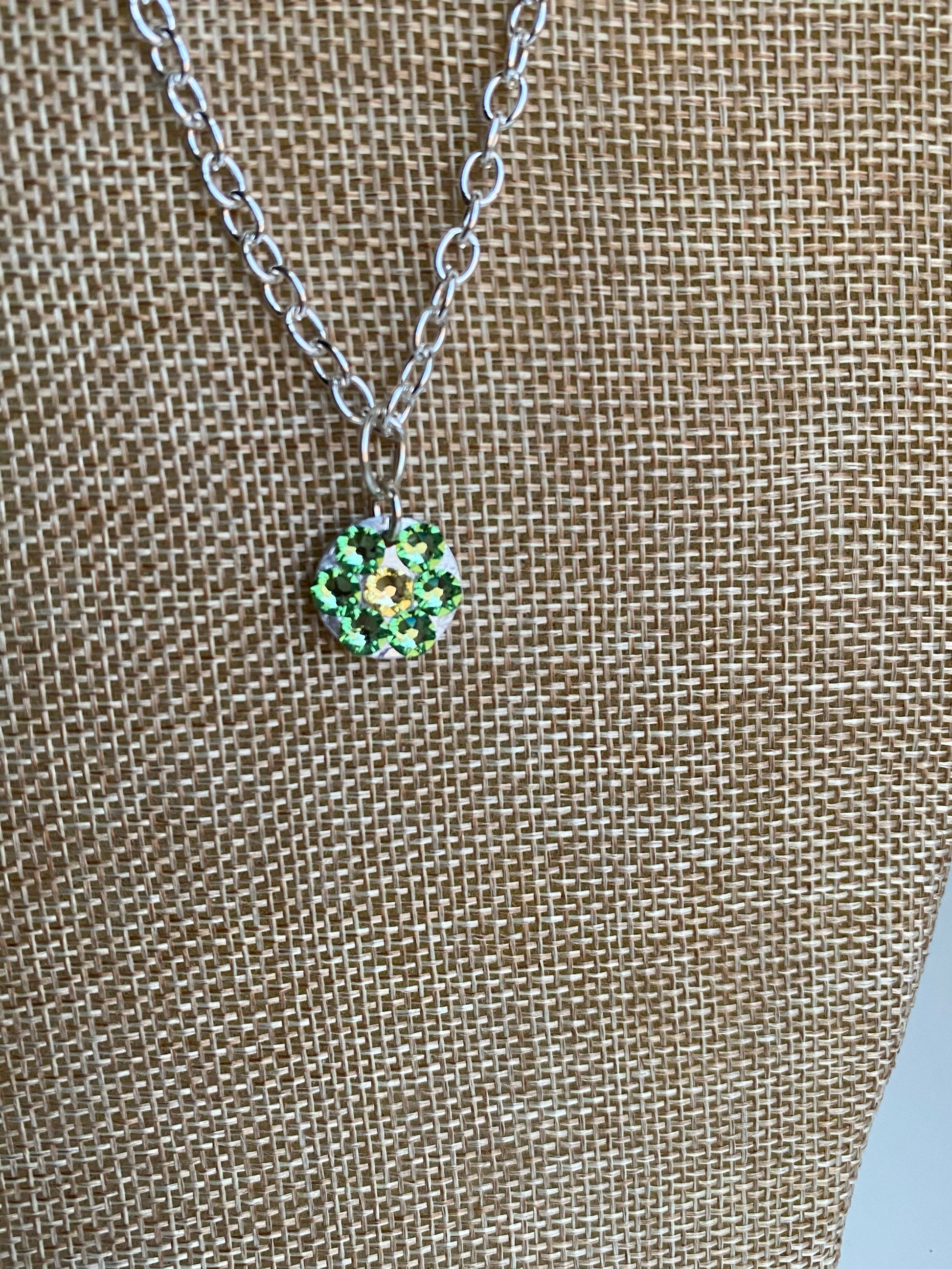 SPRING HAS SPRUNG WITH FLOWER POWER FROM THE " WHO NEEDS DIAMONDS COLLECTION ". THIS ONE IS A DOUBLE SIDED BEAUTY GLOWING WITH A YELLOW FLOWER ON ONE SIDE AND A GREEN ON THE OTHER, THAT CREATES A SHINE NO MATTER HOW IT LAYS UPON YOUR NECK.