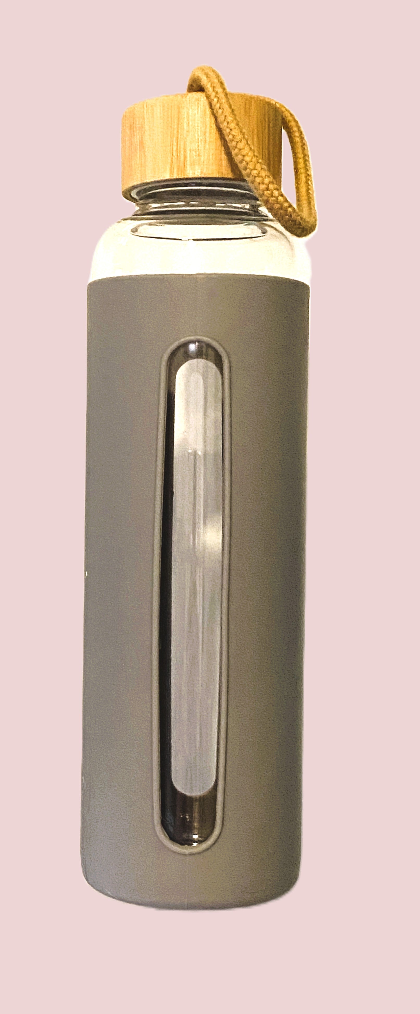 The black reflective tank provides visibility in low light, while the glass bottle features a wooden screw top, rope handle, and silicone sleeve for a secure grip. Perfect for active lifestyles.