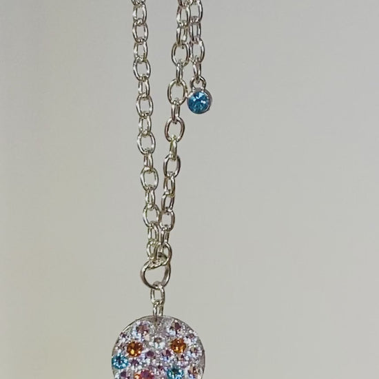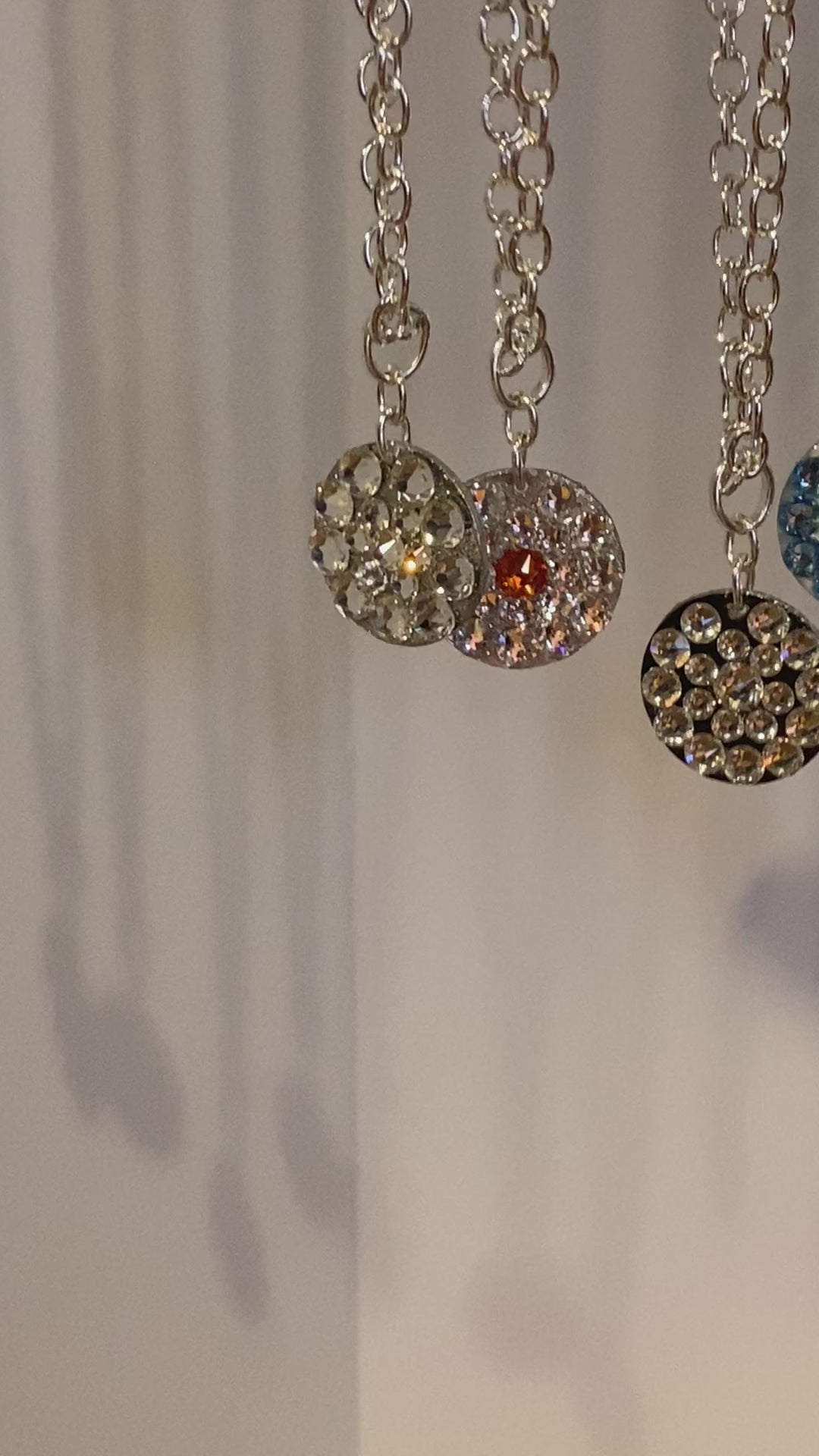 THE DIAMONDESQUE SWAROVSKI FLATS, WITH SPECS OF TURQ BLUE AND ORANGE AS IT SHINES, YOUR BLINDED BY IT'S BEAUTY. THE PENDANT IS 3/4" ROUND THAT HANGS ON A 20" LIGHTWEIGHT SILVER LINK ADJUSTABLE CHAIN WITH A CUTE ACCENT CHARM.