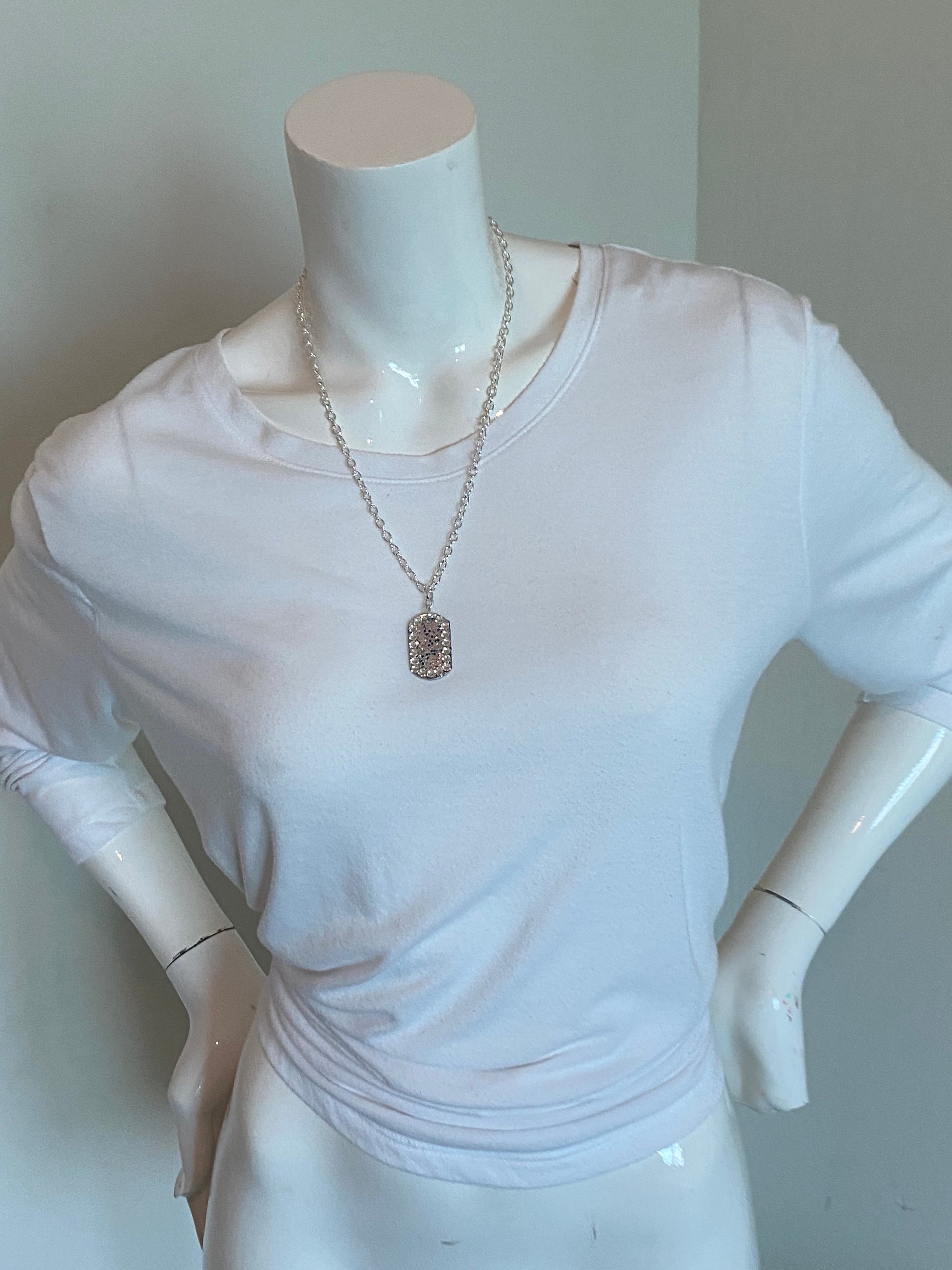 - THE PENDANT IS 1 1/4" X 3/4" DOG TAG. FULL SIZE. IT HANGS ON A 22" LIGHTWEIGHT ADJUSTABLE SILVER LINK CHAIN, WITH AN ACCENT CHARM.