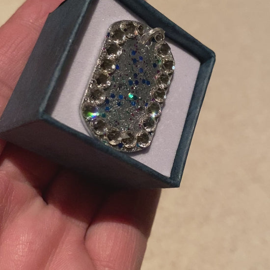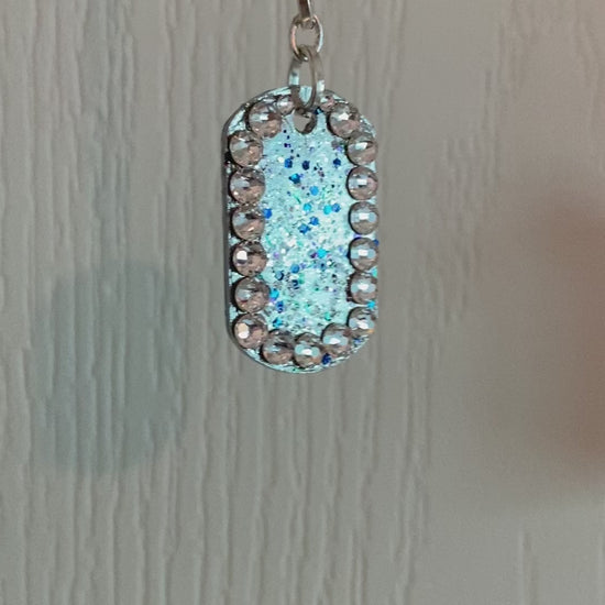 - THIS CREATIVE DOG TAG IS IN SILVER SPARKLING WITH SWAROVSKI DIAMOND SPARKLERS ALL AROUND. THEY CREATE A BRILLIANT SHINE LIKE DIAMONDS WITH SPARKLES IN THE MIDDLE, GIVING IT A LITLE KICK INTO THE UNIVERSE.